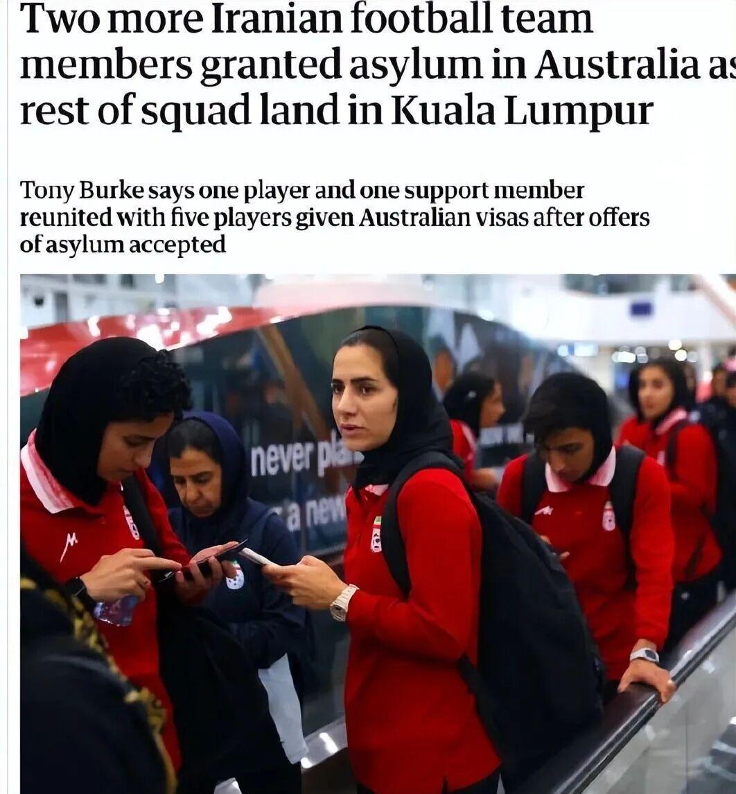 据悉,这两位登机前决定留在澳大利亚的人员,分别是一位伊朗女足球员和一位球队的后勤人员。