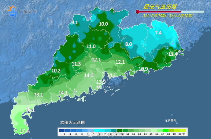 12-13日,全省大部晴间多云。最低气温:粤北、珠三角北部和粤东市县7-10℃,雷州半岛15-18℃,其余大部分市县11-14℃。