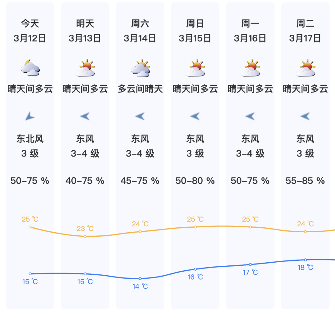 13-14日受弱冷空气影响,多云间晴天,空气干燥,气温略降,早晚清凉,昼夜温差大,沿海、高地和海区阵风7级左右;